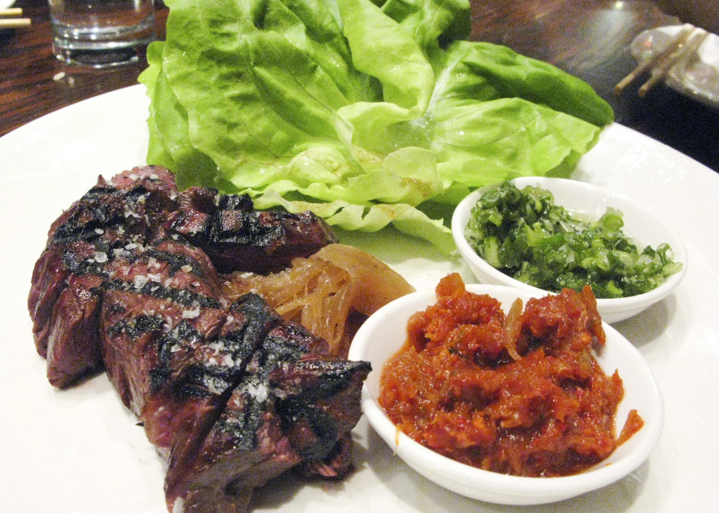 Since no one wanted to fork over 200 clams to order the house special Bo Ssam - essentially a whole roasted pork butt - flavorful skin and fall off the bone meat - served Korean style with fresh oysters, several condiments, crisp leaves of lettuce and rice. The whole idea is to make a mini burrito. Too bad we were too few to order it.. but thinking about it as I write this piece is making me salivate. Damn.