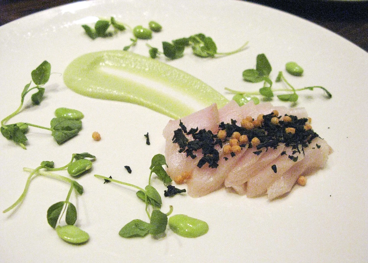 We had this nice little hamachi sashimi served on top of some pureed edamame with horseradish, some pea greens, and some crunchy bits. Great dish to get your taste buds going for other things.